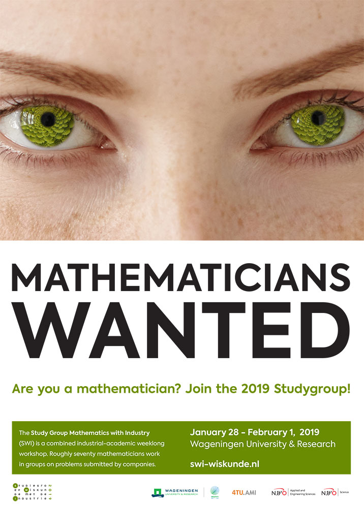 Wiskundigen, die mee willen doen aan de Studiegroep Wiskunde met de Industrie (SWI) 2019, kunnen zich nu registreren op de website. De Studiegroep is een workshop van een week, waarin wiskundigen problemen uit het bedrijfsleven oplossen. De week brengt wiskundigen samen uit de academische wereld, het bedrijfsleven en organisaties uit het publieke domein. De Studiegroep is dit jaar in Wageningen, van 28 januari tot 1 februari 2019. Wil je jouw kennis inzetten bij deze Studiegroep? Wageningen heet je van harte welkom. Meer informatie: www.swi-wiskunde.nl/swi2019