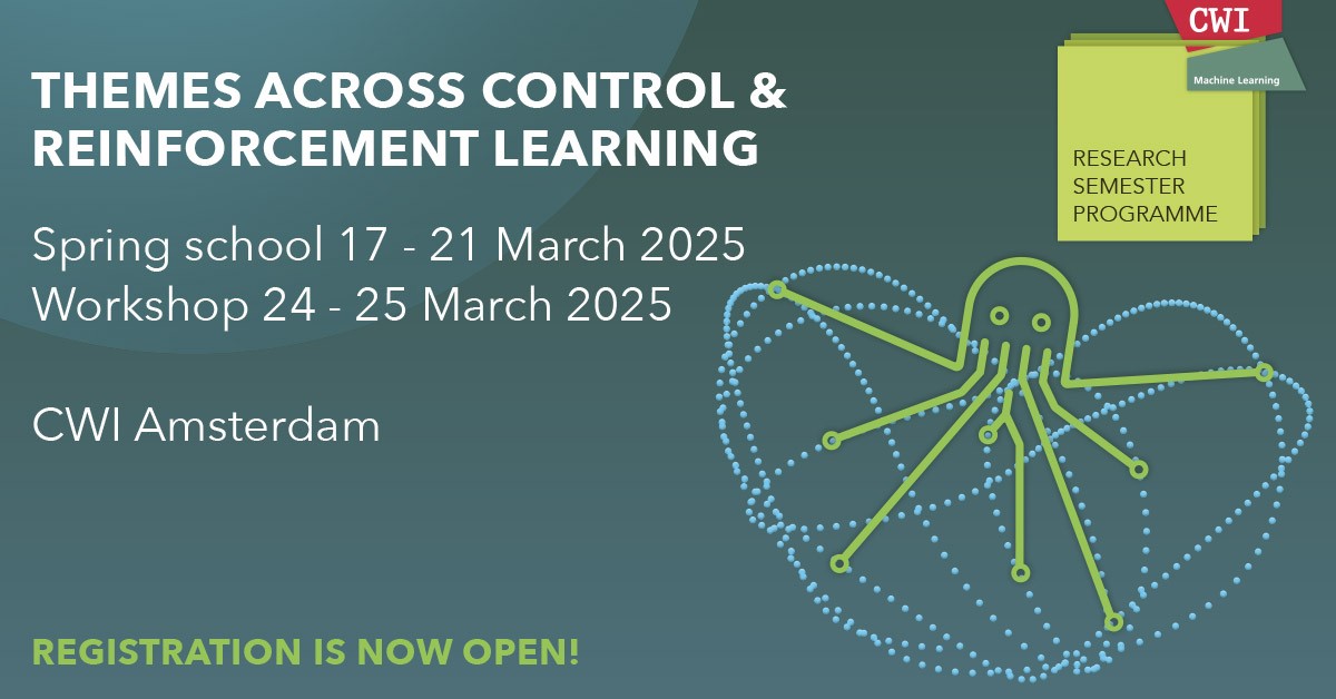 This Spring 2025 semester programme will bring together researchers in the control and reinforcement learning communities and familiarize students with methods across these inter-related fields. This CWI research semester programme will comprise a spring school and workshops on various sub-topics, orchestrated by a distinguished team including Aditya Gilra, Bert Kappen, Debabrota Basu, Frans Oliehoek, Maryam Kamgarpour and Sean Meyn, to explore the intersections and challenges within these intertwined fields. More information about the program and the events on the website of CWI