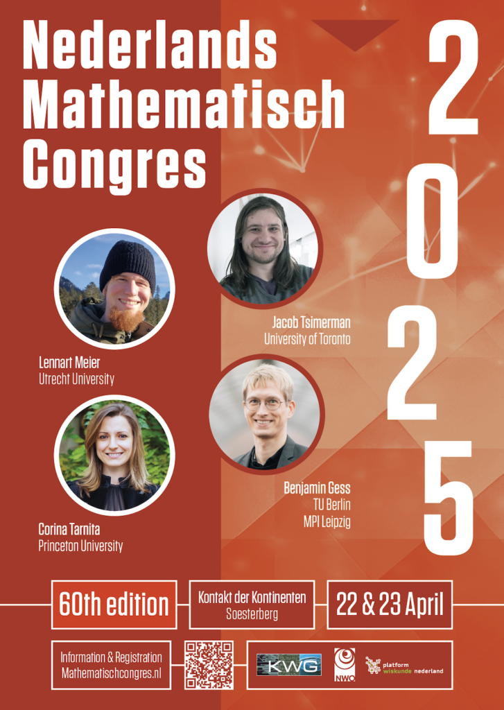 🏆 PhD thesis award: Each year the Royal Dutch Mathematical Society (KWG) organizes the KWG PhD prize for the best presentation of PhD research in mathematics. The PhD prize competition is open to PhD candidates in mathematics from all universities in the Netherlands and CWI, provided their thesis defense date is after 28 February 2025. More information here.