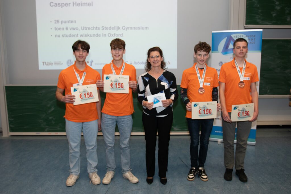 Vervolgens stond een korte terugblik op twee internationale wiskundewedstijden op het programma. Bij de European Girls’ Mathematical Olympiad (EGMO), eerder dit jaar in Kosovo, hebben alle vier de Nederlandse deelneemsters een bronzen medaille behaald. Voor deze prestatie ontvingen Alina Ju, Lisa Meij, Floortje Lusthof en Wendy Huang een prijs uit handen van bestuurslid Jaap de Jonge namens Optiver. Er was daarbij ook aandacht voor oud-trainer Merlijn Staps, als auteur van opgave 2 van deze EGMO. Bij de International Mathematical Olympiad (IMO) in Australië afgelopen zomer waren er maar liefst vijf bronzen medailles voor het Nederlandse team. Tobias Kristiansen, Naïm Hofstede, Josiah ’t Hart, Roel Alkemade en Casper Heimel ontvingen hiervoor een prijs uit handen van Annoesjka Cabo, voorzitter van de onderwijscommissie van Platform Wiskunde Nederland.