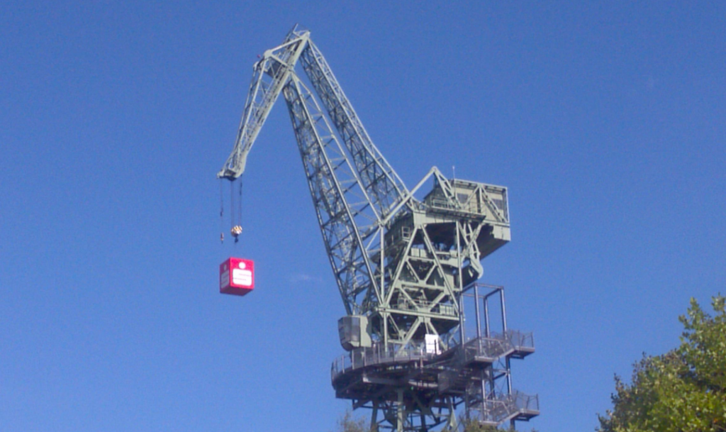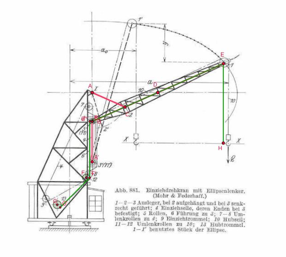 Links: Der Eber’ in Eberswalde: Dit Doppellenkersystem für Drehkrane werd 1932 aldaar door de Ardelt-Werke uitgevonden. Rechts: intrekdraaikraan met ellipssturing, tekening uit het artikel Lemniscaten en kranen van Rainer Kaenders.