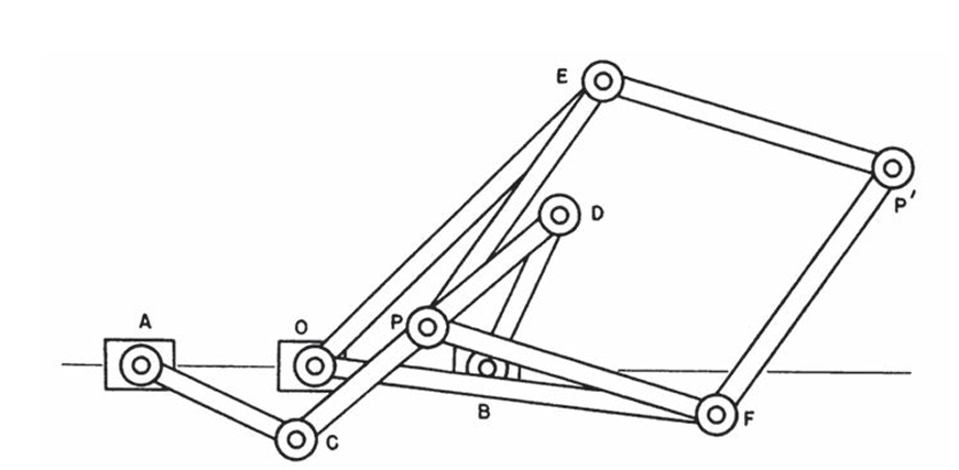 Links: een voorbeeld van een Strandbeest van Theo Jansen. Rechts: Schema voor stangenmechanismes waarmee alle kegelsneden (ellips, parabool en hyperbool) getekend kunnen worden mits |AC| = |BD| = en |AB| = |CD| als ook |AO|=|PD| de passende lengte hebben. Zie ook [2] voor meer informatie.